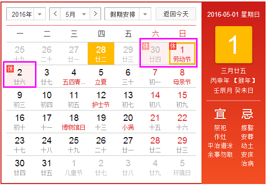 2016年五一劳动节放假时间:2016430——5月2周六周日周一共三天
