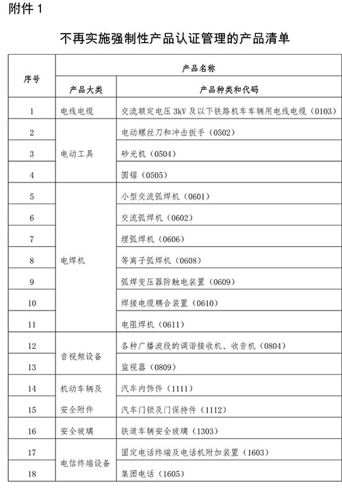 1、对18种产品(见附件1)不再实施强制性产品认证管理的产品清单。