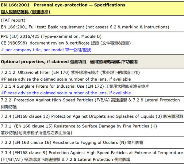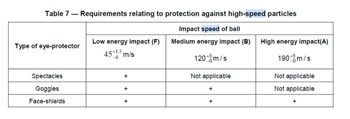 例如7.2.2 Protection Against High-Speed Particles(F/B/A)高速撞擊&7.2.8 Lateral Protection側向防護,这个标准对应撞击的等级是由眼面部防护用品防护部位和性能决定的,可参考表7: